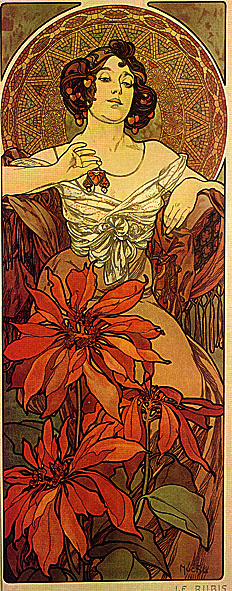 Les femmes personnifiant les pierres précieuses dégagent une impression de pleine sensualité. La partie supérieure de chaque panneau est dominée par le visage et la posture féminine alors que le bas de la composition représente une fleur, dont les couleurs sont typiques de la pierre précieuse évoquée. Dans l'ordre sont représentés : la Topaze, le Rubis, l'Emeraude et l'Améthyste.