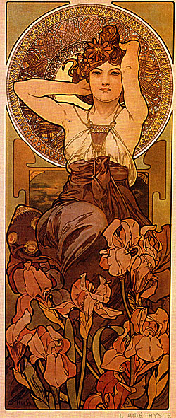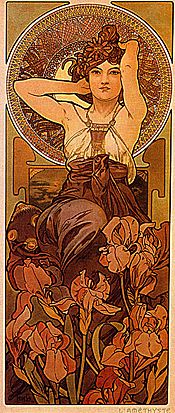 Dans le projet originel, Mucha avait le dessein de représenter l'Améthyste avec un buste dénudé comme en témoigne (en survolant l'image) le dessin d'étude pris sur le modèle. Mais l'imprimeur Champenois s'y refusa de peur de critiques pudibondes.